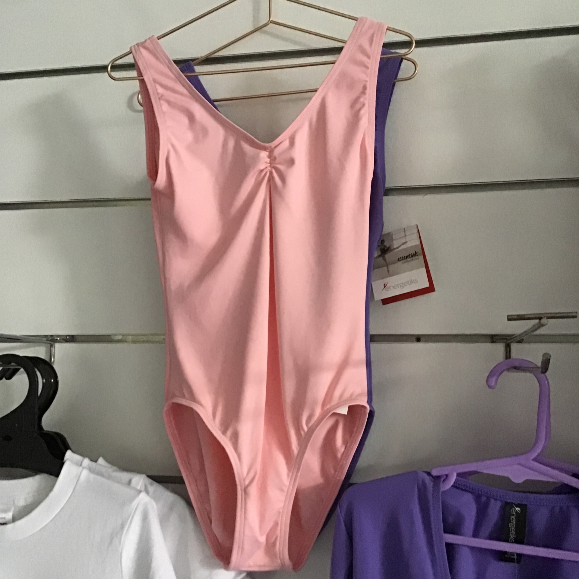 Thick strap, rouched front leotard in pink.